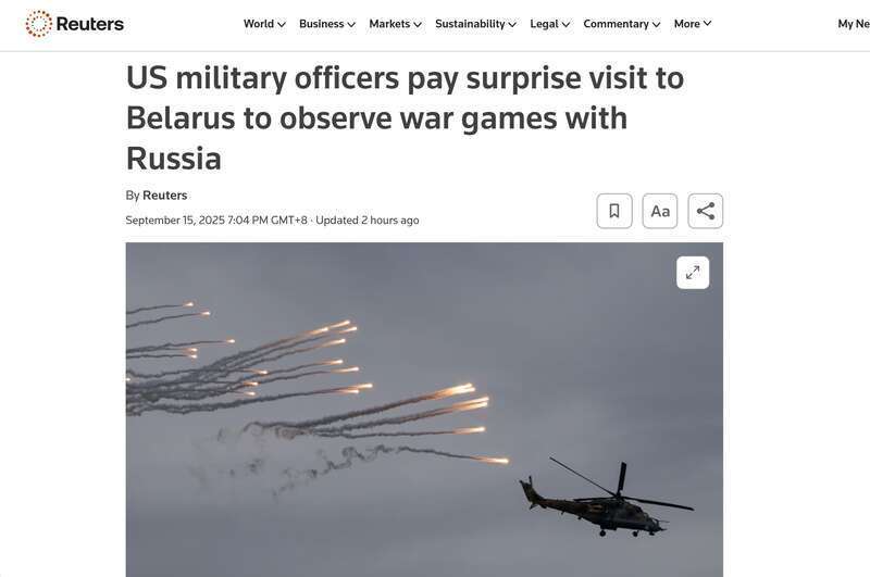 演习场上,来自美国的访客格外引人注目。当地时间15日,白俄罗斯国防部发布的视频显示,两名身着制服的美军军官与白俄罗斯国防部长赫列宁握手。赫列宁没有接受媒体采访,但表示,外国观察员“可以研究他们感兴趣的任何东西”。总共23个国家派员观摩了“西方-2025”演习,其中包括北约成员国土耳其和匈牙利。