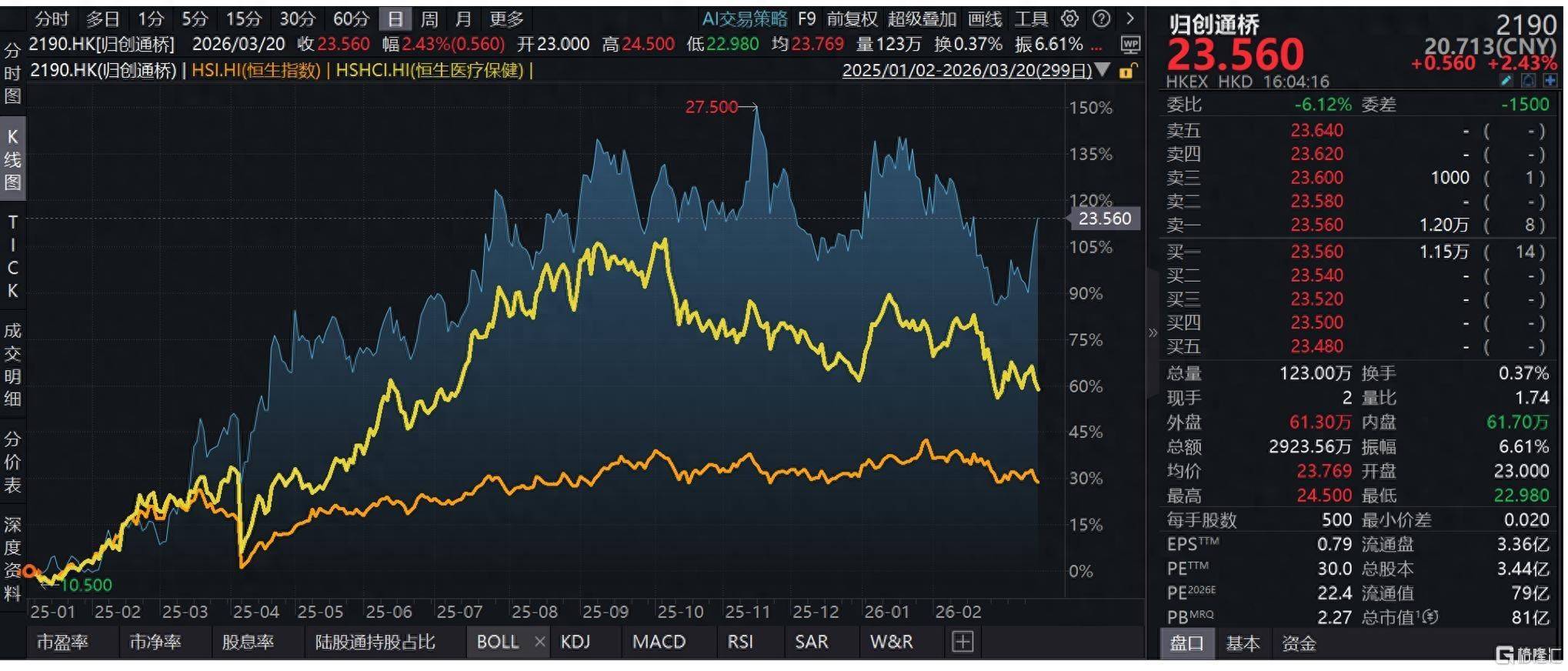蓝线:归创通桥,黄线:恒生指数
