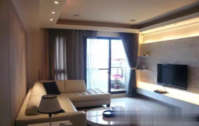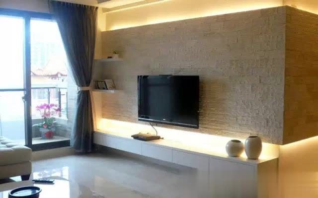 通铺瓷砖,客厅光线极佳,电视墙采用文化石搭配灯带