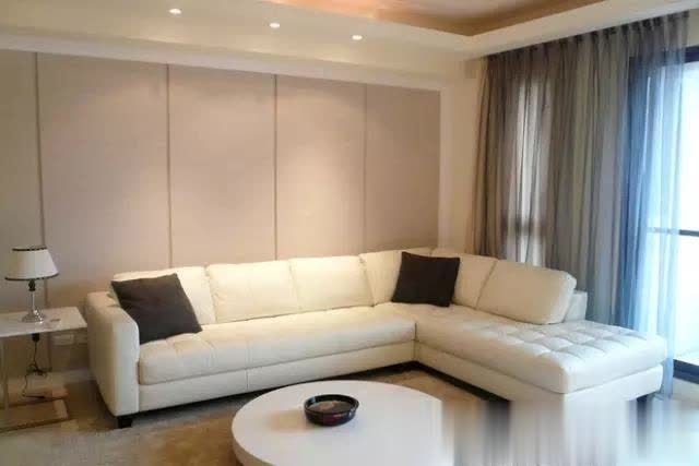 沙发背景为暖色硬包,搭配皮质暖色沙发