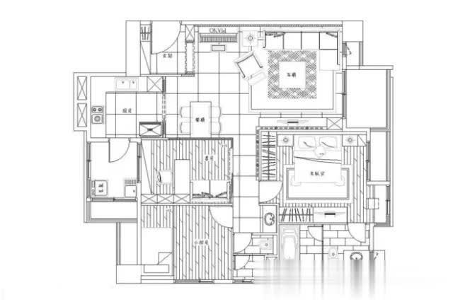 电视墙文化石背景延伸至过道,不仅放大空间,还暗藏灯带